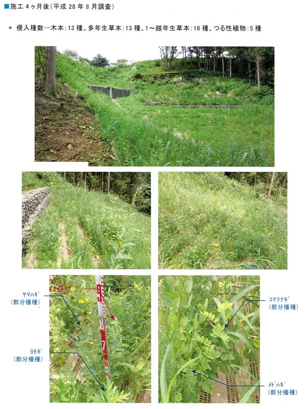 | 特記事項 | 蔵王国定公園に近接し、周辺を樹木に囲まれた環境にあることから、周辺環境への配慮を目的とした自然侵入植生工の導入が望ましいが、自然災害による崩壊現場であることから、植生被覆速度を速めるため、一部緑化用植物を導入した部分播種タイプが採用された。 |