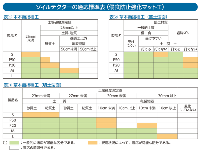 道路土工指針の選定フロー(草本類播種工等) 草本類主体で緑化を行う場合に使用する選定フローです。 詳しく見る 道路土工指針の選定フロー(木本類播種工等) 木本類主体で緑化を行う場合に使用する選定フローです。 詳しく見る 自然侵入促進工の選定フロー 自然環境重視地域等において、周辺植物の自然侵入で緑化を行う場合に使用する選定フローです。 詳しく見る 侵食防止強化マットの適応標準表 ソイルテクターを使用する場合の適応標準表です。 詳しく見る ヤシ繊維ネット付 植生マットの適応標準表 ナチュラルパームマットを使用する場合の適応標準表です。 詳しく見る